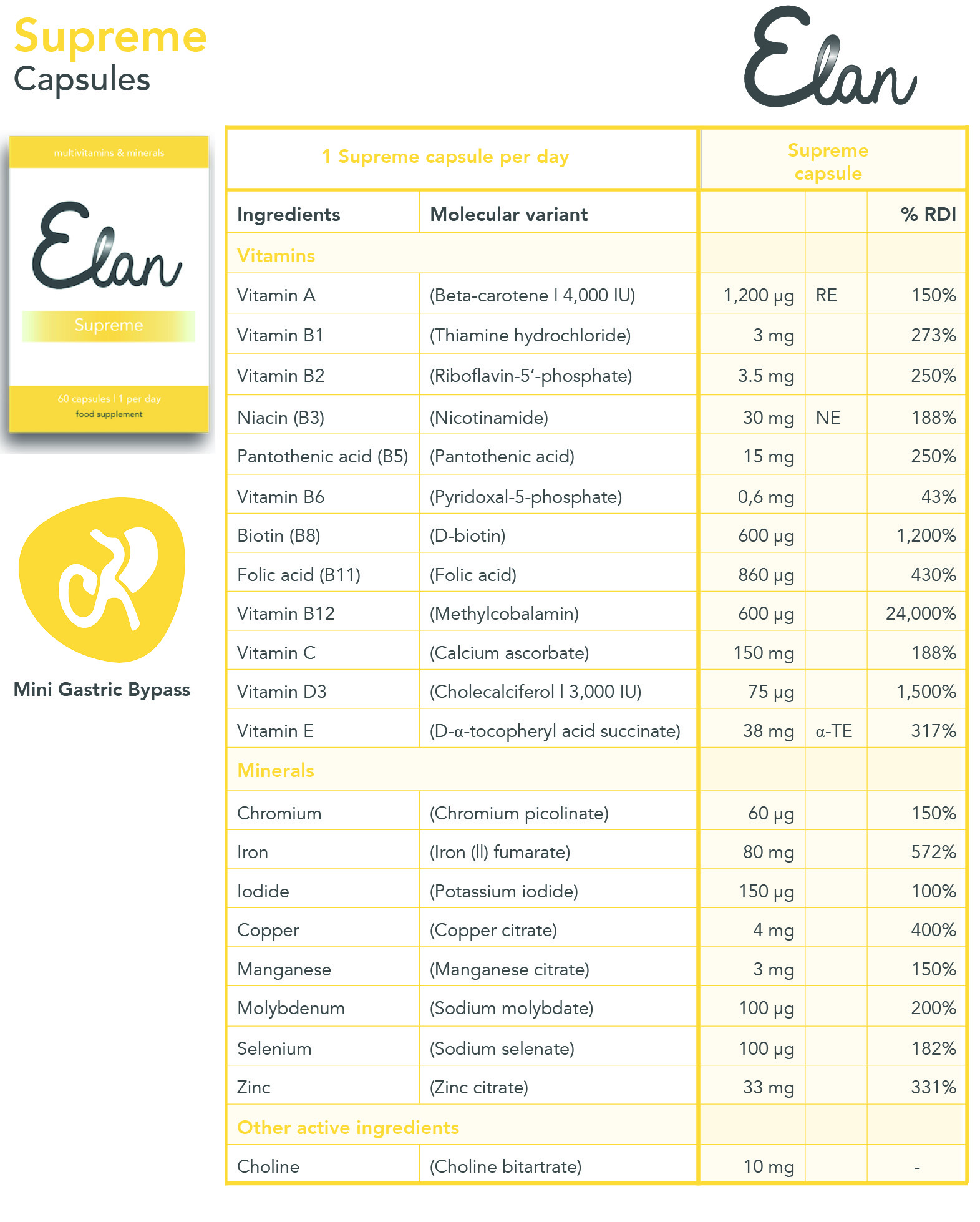 La composition des gélules Supreme est basée sur les dernières recherches scientifiques pour répondre le plus précisément possible à vos besoins quotidiens et assurer le meilleur dosage individuel possible. Les ingrédients contenus dans les gélules Supreme sont naturels et facilement absorbés par l’organisme. Étant donné que vous devez continuer à prendre un supplément WLS (« Weight Loss Surgery ») tous les jours après votre mini bypass gastrique à vie afin de ne pas développer de carences en vitamines et/ou minéraux, ELAN accorde une grande attention à la tolérabilité de ses produits.